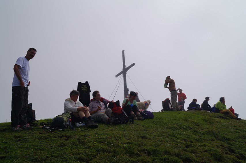 Gruppe beim Rasten im Nebel unterhalb des Lackenkogels, 19. August 2014